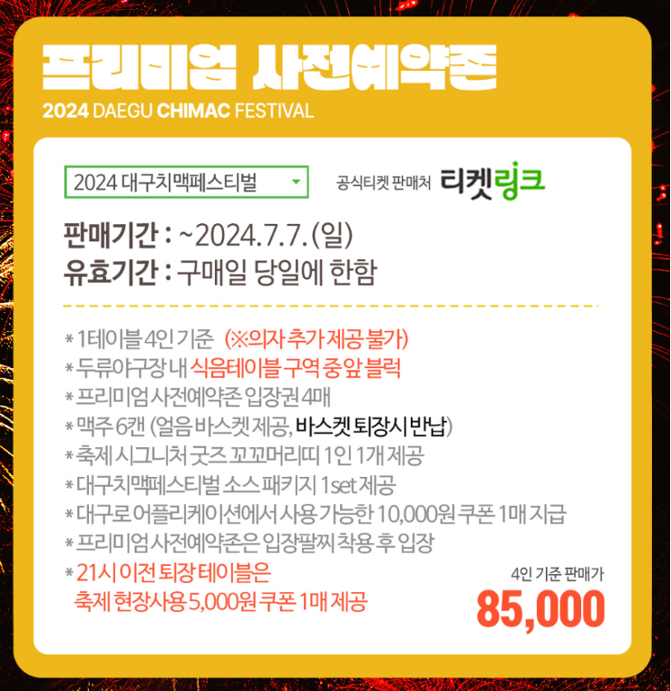 대구치맥페스티벌 사전예약으로 티켓을 구매하신다면 위 내용처럼 프리미엄 사전예약존에서 보다 편하고 가깝게 먹거리와 공연을 즐길 수 있는 큰 혜택이 있습니다.